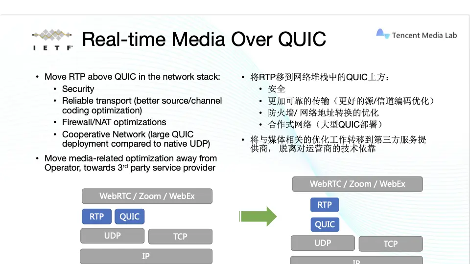 将RTP移到网络堆栈中的QUIC上方实现:1)安全,更加可靠的传输(更好地源/信道编码优化);2)防火墙/网络地址转换的优化;3)合作式网络(大型QUIC部署);将与媒体相关的优化工作转移到第三方服务提供商,脱离对运营商的技术依靠。