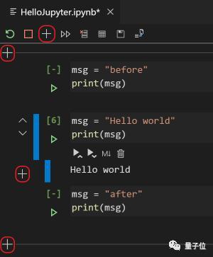 但是Jupyter笔记本通常不会只有一个单元格。点击笔记本底部或者顶部的的“+”图标,都可以添加新的代码单元格。