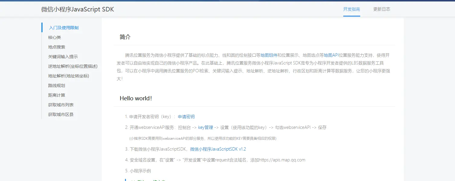 小程序地址解析/逆解析 卡拉OK 2019-10-22 1,629 阅读1分钟 小程序getLocation无法得到精确地址只有经纬度,我们需要通过腾讯提供的位置服务接口进行操作 1、进入腾讯位置服务点击接入指引,完成设置获得开发密钥 2、进入微信小程序JavaScript SDK 查看入门及使用限制,下载SDK。