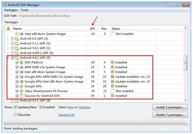 c.勾选你要现在的API版本和对应的android版本,后面模拟器会用到,然后坐等下载
