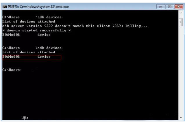 b.打开cmd输入:adb devices,当屏幕上出现一串字符,后面显示devices说明连接成功(出现其它的提示,得检查环境了)