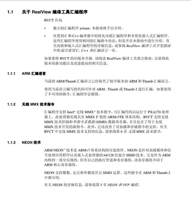 本pdf提供相关RealView编译工具(RVCT)汇编程序的指导呵参考信息。这包括armsam.独立的汇编程序已经C和C++编译器中的嵌入式汇编程序。本手册介绍汇编程序的命令行选项,可提供汇编语言程序员使用的汇编语言助记符,伪指令,宏和指令。