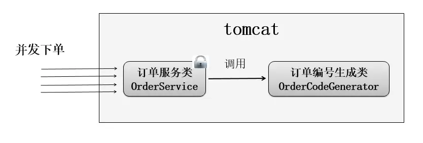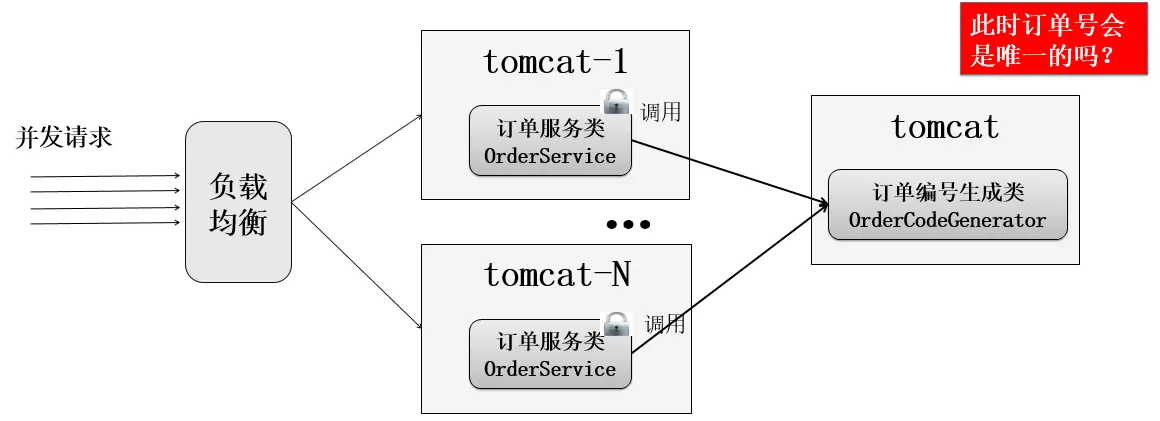 在各tomcat中使用了各自的锁(jvm的锁),但不能保障订单号唯一。