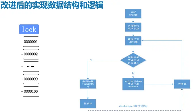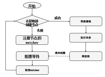 * 获取锁:取排队号(创建自己的临时顺序节点),然后判断自己是否是最小号,如是,则获得锁;不是,则注册前一节点的watcher,阻塞等待