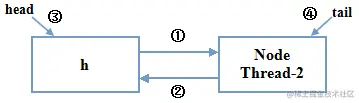 被阻塞的线程2是被阻塞在第14行,注意这里并没有return语句,也就是说,阻塞完成线程2依然会进行for循环。然后,阻塞完成了,线程2所在的Node的前驱Node是p,线程2尝试tryAcquire,成功,然后线程2就成为了head节点了,把p的next设置为null,这样原头Node里面的所有对象都不指向任何块内存空间,h属于栈内存的内容,方法结束被自动回收,这样随着方法的调用完毕,原头Node也没有任何的引用指向它了,这样它就被GC自动回收了。此时,遇到一个return语句,acquireQueued方法结束,后面的Node也是一样的原理。