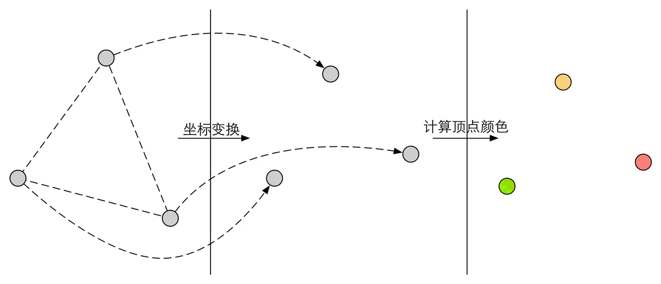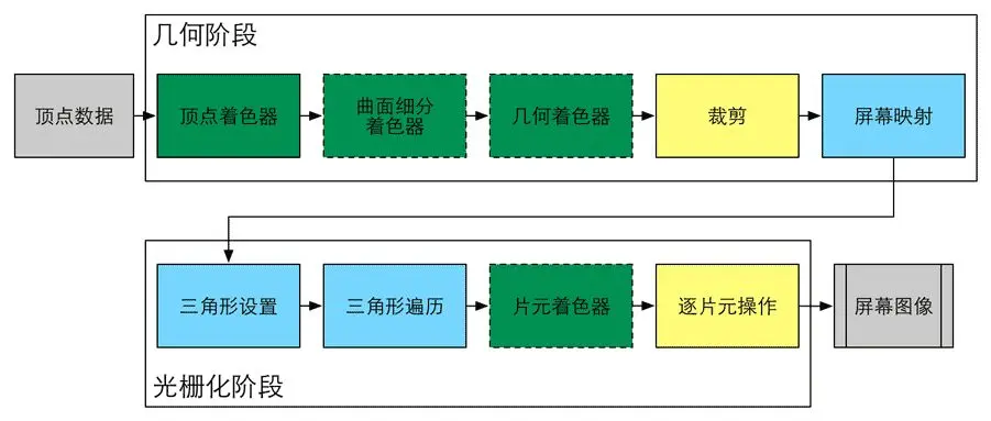 几何阶段是在GPU上进行的,主要任务是输出屏幕空间的顶点信息。几何阶段用于处理从上一阶段接收到的待绘制物体的几何数据(可以理解为Draw Call指向的图元列表),与每个渲染图元打交道,进行逐顶点,逐多边形的操作。几何阶段的一个重要任务就是把顶点坐标变换到屏幕空间中,再交给光栅化器进行处理。通过对输入的图元进行多步处理后,这一阶段将会输出屏幕空间的二维顶点坐标,每个顶点对应的深度值,着色等相关信息。