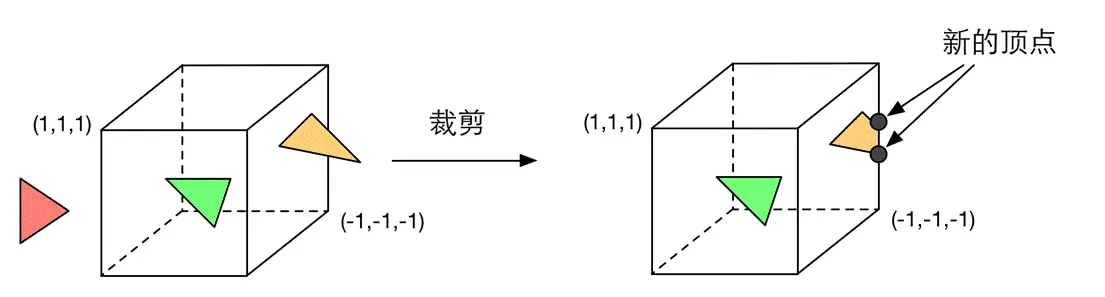 裁剪阶段的目的是将那些不在摄像机视野内的顶点裁减掉,并剔除某些三角图元的面片(面片通常是由一个一个更小的图元来构成的)。 一个图元和摄像机视野的关系有3种:完全在视野内,部分在视野内,完全在视野外。完全在视野内的图元就继续传递给下一个流水线阶段,完全在视野外的图元不会继续向下传递,因为它们不需要被渲染。而那些部分在视野内的图元需要被裁剪。例如,一条线段的顶点在视野内,而另一个顶点不在视野内,那么在视野外部的顶点应该使用一个新的顶点来代替,这个新的顶点位于这条线段和视野边界的交点处。