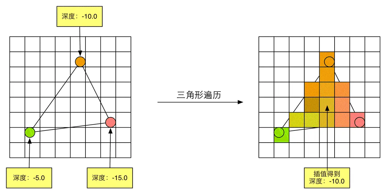 三角形遍历阶段将会检查每个像素是否被一个三角网格所覆盖。如果被覆盖的话,就会生成一个片元。而这样一个找到哪些像素被三角网格覆盖的过程就是三角形遍历,这个阶段也被称为扫描变换。 三角形遍历阶段会根据上一个阶段的计算结果来判断一个三角网格覆盖了哪些像素,并使用三角网格3个顶点的顶点信息对整个覆盖区域的像素进行插值。像素和片元是一一对应的,每个像素都会生成一个片元,片元中的状态记录了对应像素的信息,是对三个顶点的信息进行插值得到的。