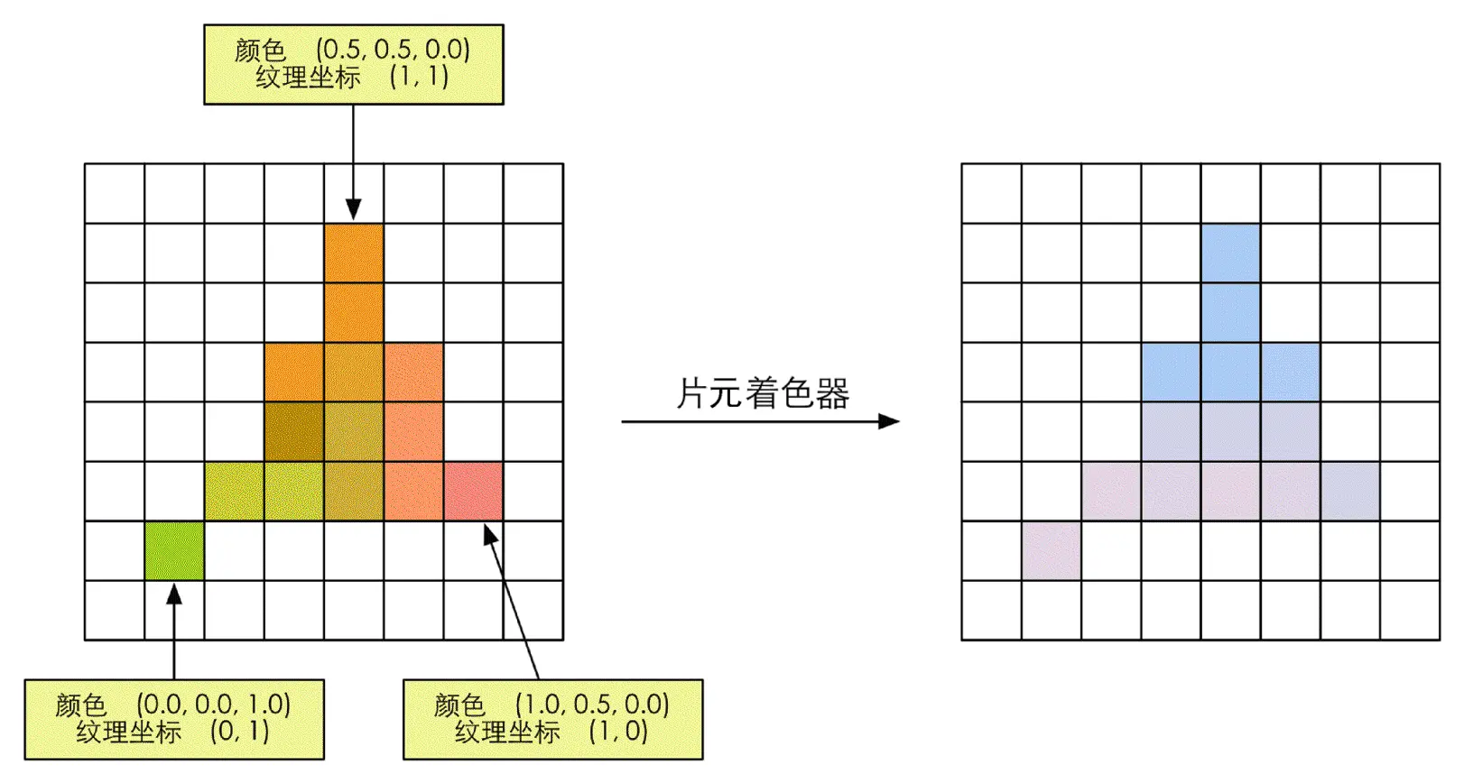 片元着色器用于实现逐片元的着色操作,输出是一个或者多个颜色值(即计算该片元对应像素的颜色,但不是最终颜色)。这一阶段可以完成很多重要的渲染技术,其中最重要的技术之一就是纹理采样。为了在片元着色器中进行纹理采样,我们通常会在顶点着色器阶段输出每个顶点对应的纹理坐标,然后经过光栅化阶段对三角网格的3个顶点对应的纹理坐标进行插值后,就可以得到其覆盖的片元的纹理坐标了。