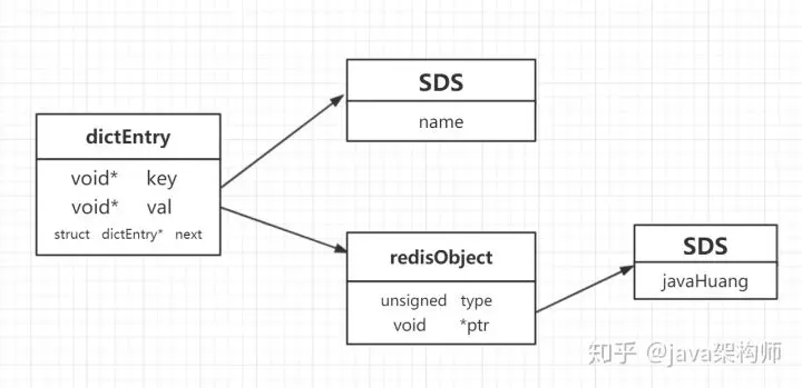 } dictEntry;key 是字符串,但是 Redis 没有直接使用 C 的字符数组,而是存储在自定义的 SDS