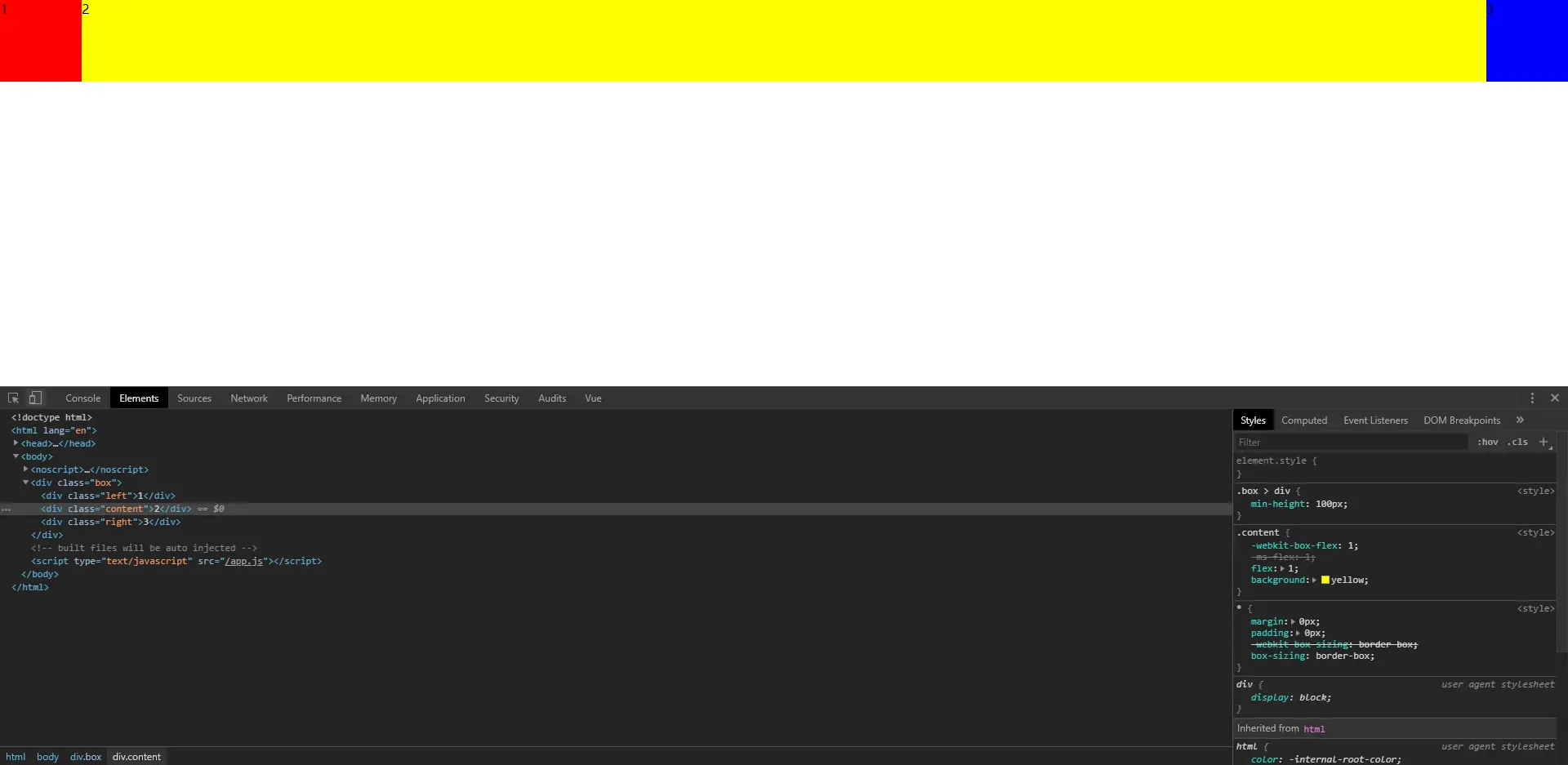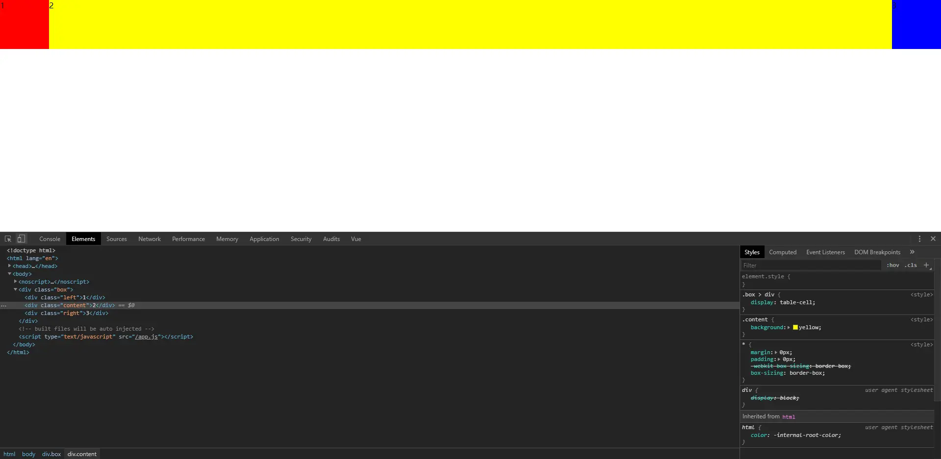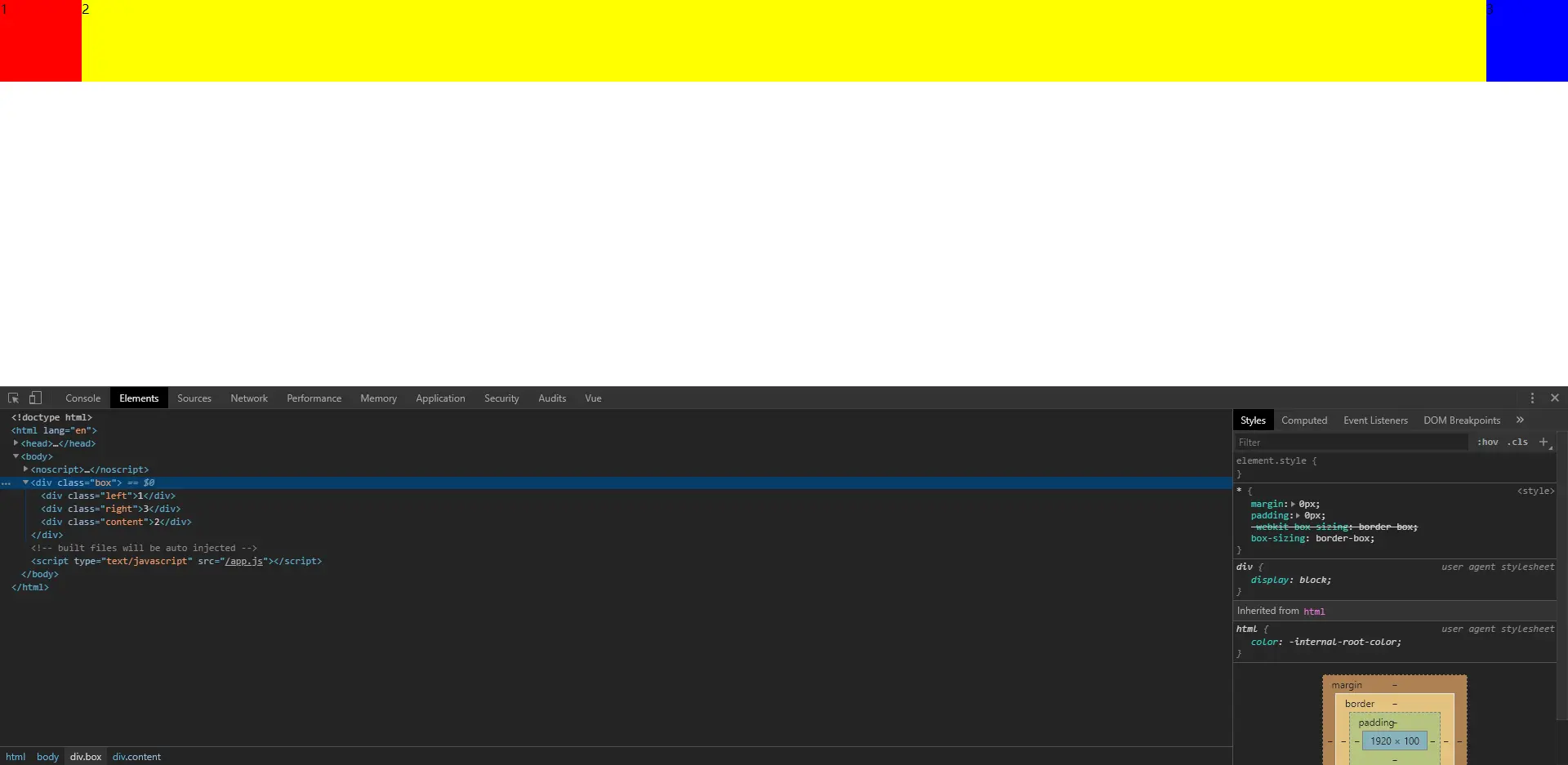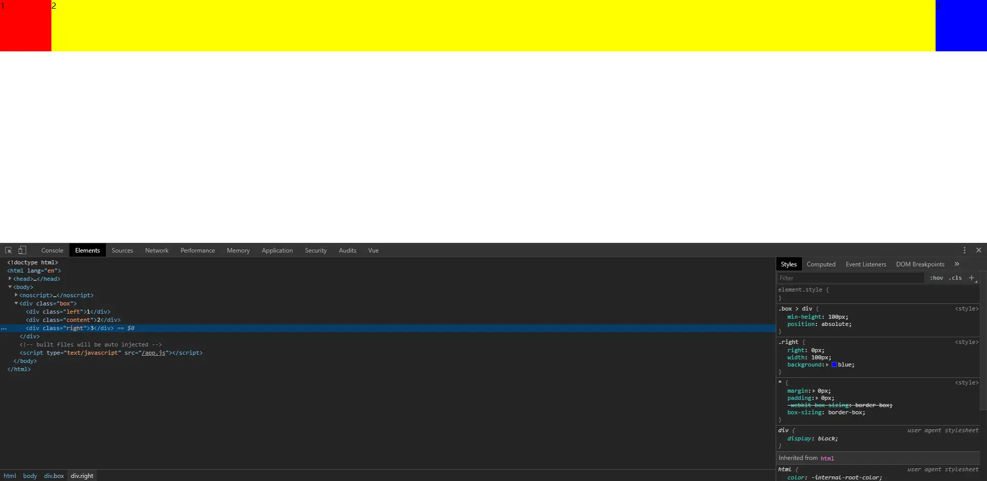 这种布局方式是利用浮动脱离文档流实现的,这里需要特别注意一下,left、right都在content前面布局,如果按照正常的顺序left-content-right,中间元素形成定位,那么就会将right顶下去。无法实现三栏布局。