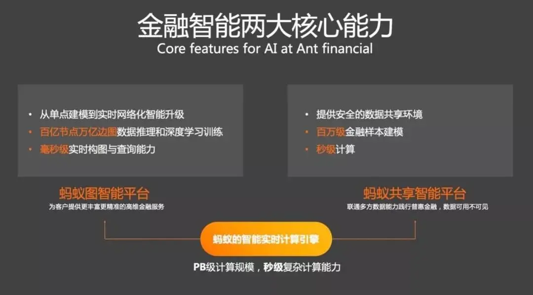 在过去几年里,我们构造了两个非常关键的学习能力,分别是蚂蚁图智能平台和蚂蚁共享智能平台。蚂蚁图智能平台支持百亿节点/万亿边的图数据推理和深度学习训练、毫秒级实时构图与查询能力;蚂蚁共享智能平台提供安全可信的数据共享和机器学习算法的跨机构联合建模能力,支持对百万级金融样本建模,秒级计算。