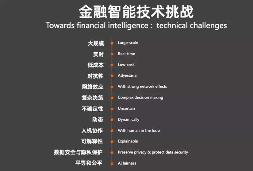 那么从金融行业的角度,目前对金融智能有哪些机会和挑战?我们总结,它主要集中在复杂动态网络、对抗性、人机协作、公平性、数据安全和隐私保护,以及不确定性几个方面。