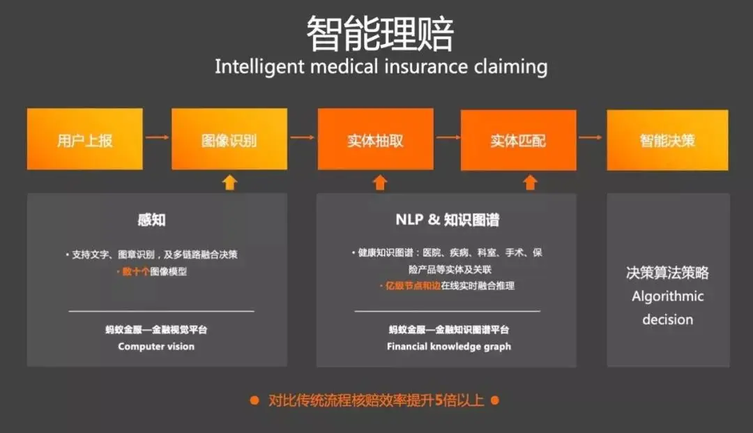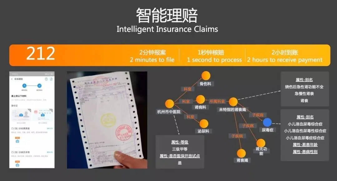 这里面的流程是,用户通过支付宝上传材料,我们基于金融级图像识别能力识别材料中的非结构化的文字、图章等信息,并结合NLP与健康知识图谱理解背后说什么,再抽取关键信息进行后续的校验和分析推理,从而进行智能理赔决策。
