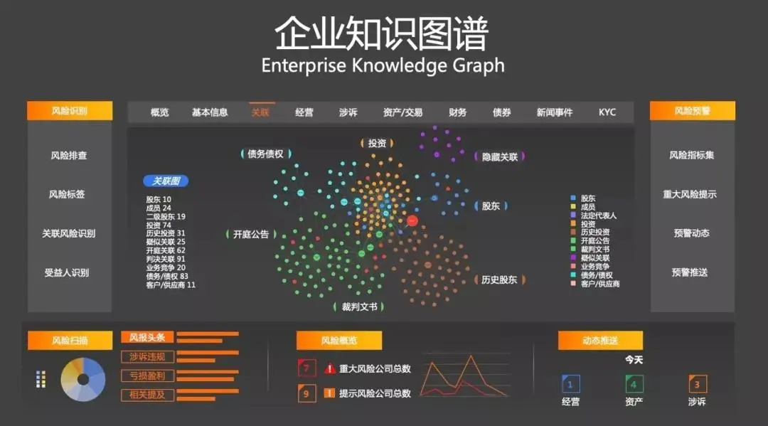 另一个案例是企业知识图谱。很多金融的风险来自于各方信息不对称,我们希望通过知识图谱来减少这种信息不对称。我们把非结构化的数据结构化,相关的数据通过相关的关联面联系起来,形成企业知识图谱,用来理解当前面临的重大风险,公司的风险指数,相关的风险级别等。