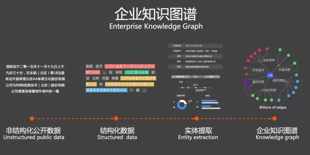 它的背后是一整个处理链条,比如这一段非结构化的自然语言的法律文本,我们把它给结构化,并把主体提取以后变成有效的知识图谱,就可以辅助分析和推理。