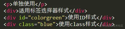 对第三个<div>标签使用class选择器(blue)和标签选择器(red)