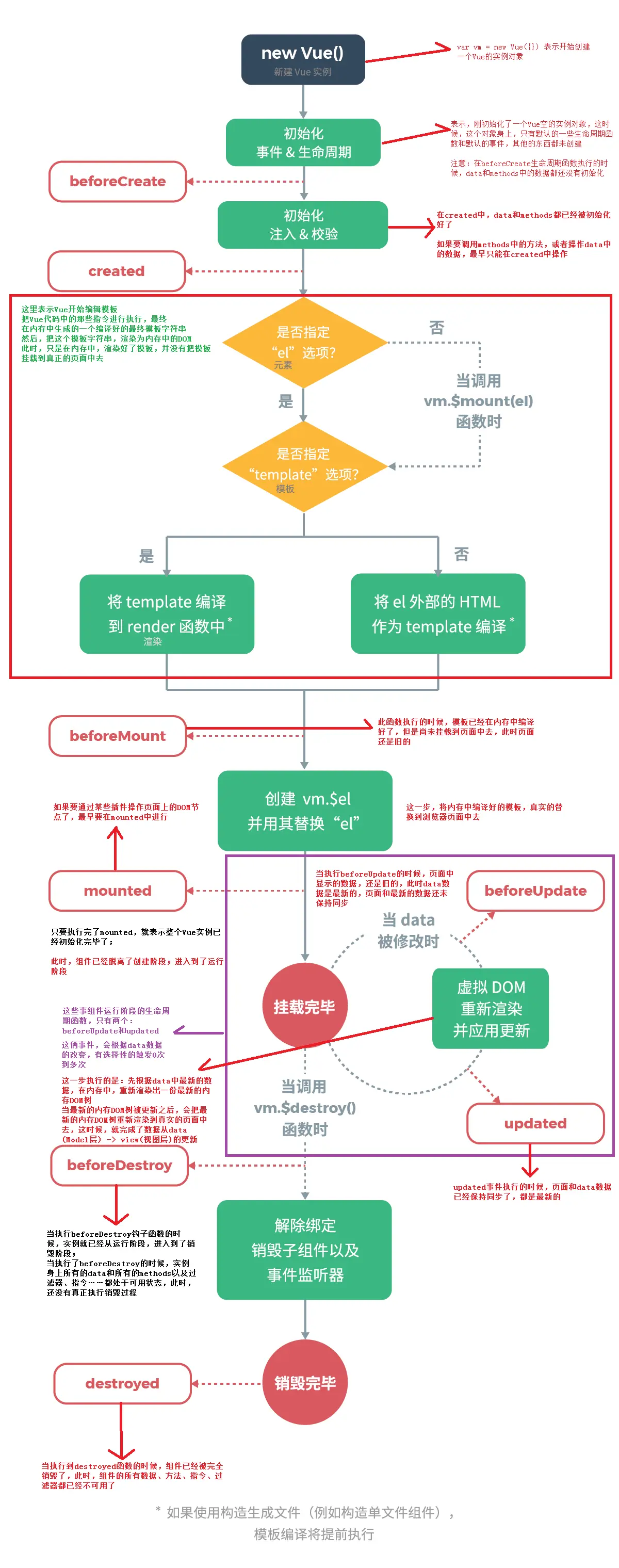 - created:实例已经在内存中创建好,此时data和methods已经创建好,此时还没有开始编译模板
