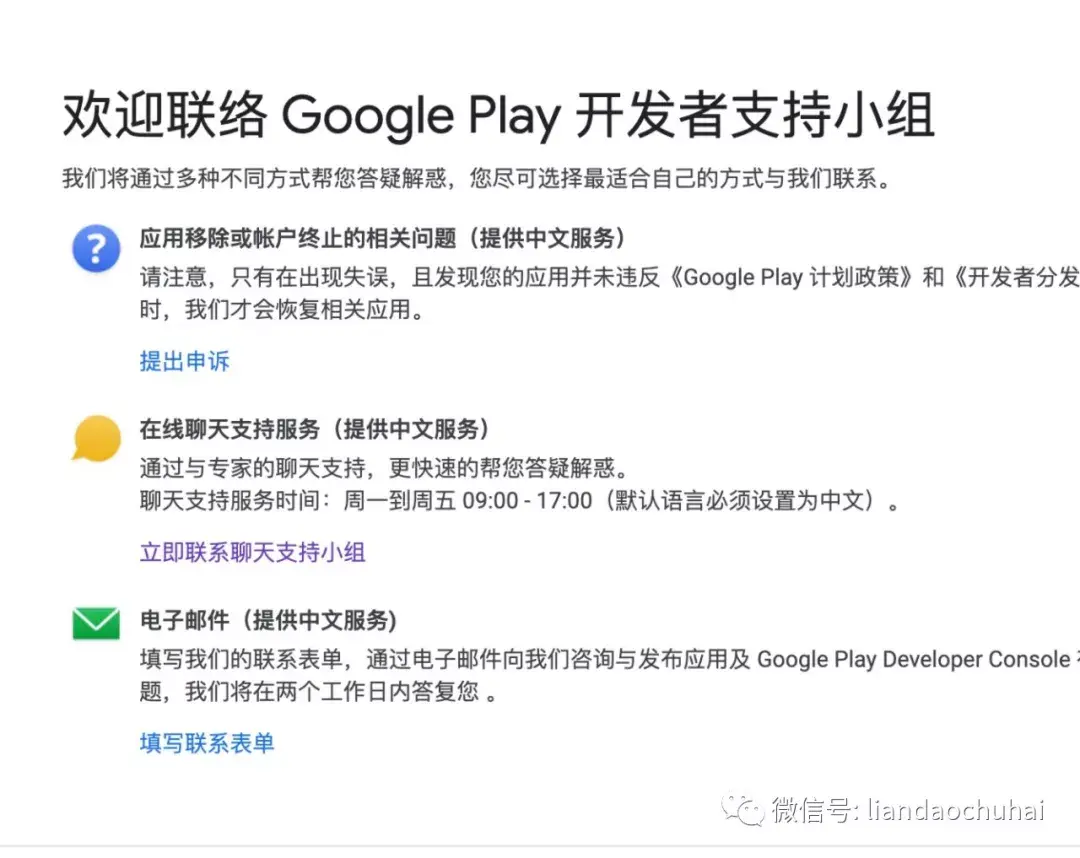 这张图就是联系开发者小组的页面,第一个是账户或者应用出问题了,申诉使用的,这个联系的是google play政策团队。第二个是及时在线聊天,可以立马和google play开发者支持小组联系上,但是要注意人家的服务时间是正常的工作时间。第三个是咨询使用过程中的问题,邮件的方式是比较慢的,是在非工作时间可以操作的方式,算是对即时聊天的补充。这几个联系方式我都使用过,很靠谱,虽然不会百分百解决问题。这个页面链接我在星球”出海产品记“里发布,有兴趣的可以关注下,这个星球是免费的,目前开始起步。