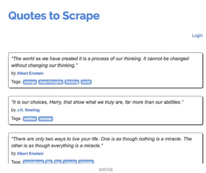 接下来我们测试下基本的页面渲染操作,这里我们选用的网址为:quotes.toscrape.com/js/,这个页面是 JavaScript 渲染而成的,用基本的 requests 库请求得到的 HTML 结果里面是不包含页面中所见的条目内容的。