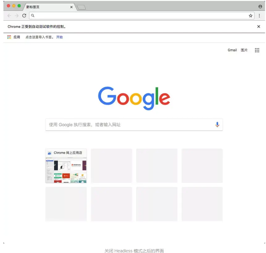 首先可以试用下最常用的参数 headless,如果我们将它设置为 True 或者默认不设置它,在启动的时候我们是看不到任何界面的,如果把它设置为 False,那么在启动的时候就可以看到界面了,一般我们在调试的时候会把它设置为 False,在生产环境上就可以设置为 True,我们先尝试一下关闭 headless 模式: