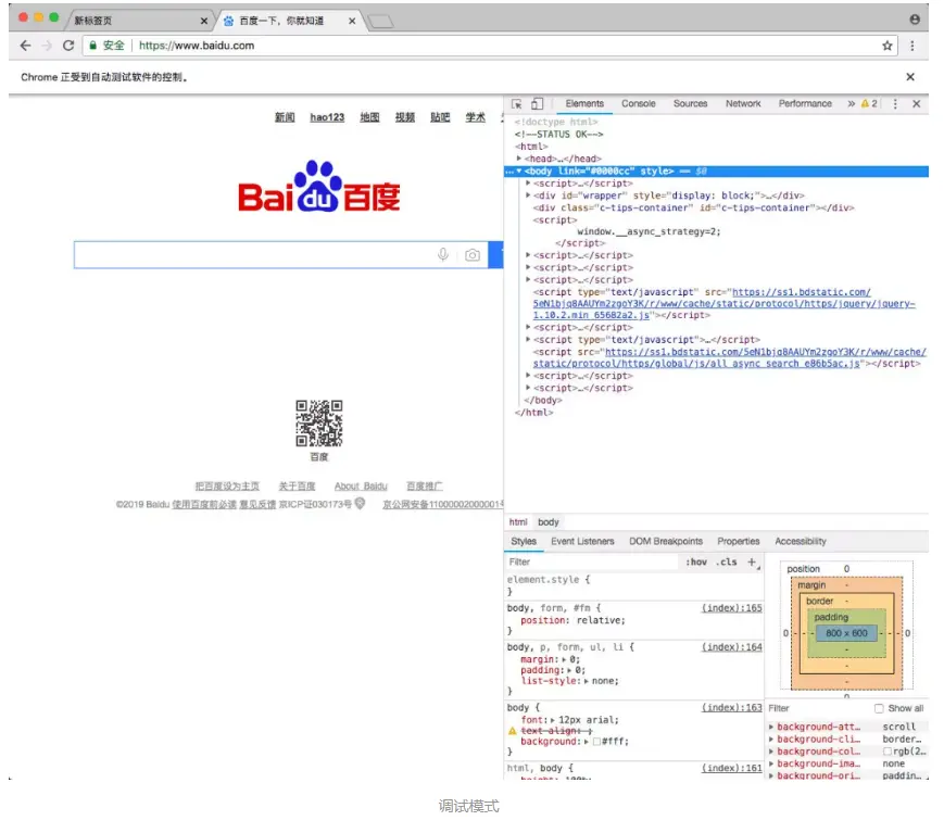 这时候我们可以看到上面的一条提示:"Chrome 正受到自动测试软件的控制",这个提示条有点烦,那咋关闭呢?这时候就需要用到 args 参数了,禁用操作如下: