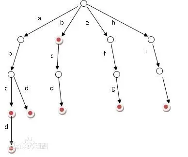 跟节点通常都是空,不同的单词组成一条条的通路,形成了一个树状结构。