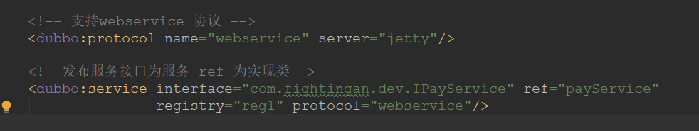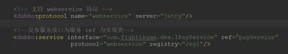 <dubbo:service interface="com.fightingan.dev.IPayService" ref="payService" registry="reg1"/>