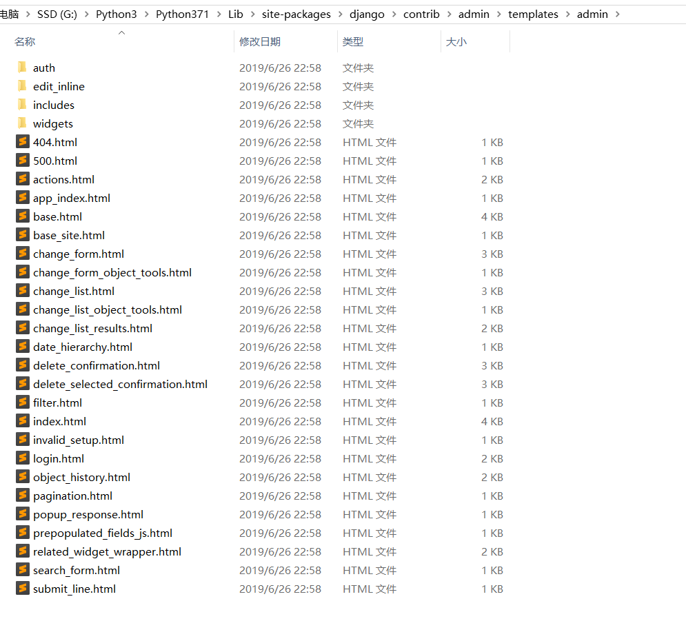 2)打开当前环境中Django的库目录,再向下找到admin的模板,目录如下: