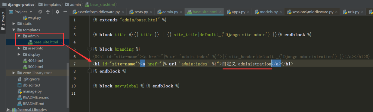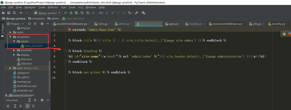 3)将需要更改文件拷贝到第一步建好的目录里,此处以base_site.html为例。