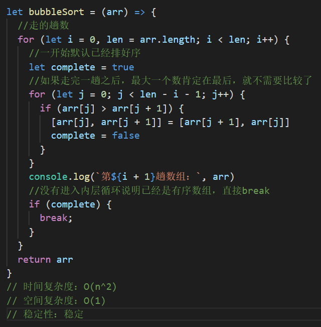 冒泡排序其实就是遍历一个数组,比较当前元素和下一个元素,如果当前元素比下一个大,向上冒泡。下次循环继续上面的操作,不循环已经排好序的数。其实你可以理解成每次比较两个数,把大的放后面,这样一趟就可以把最大的数放在最后面了。
