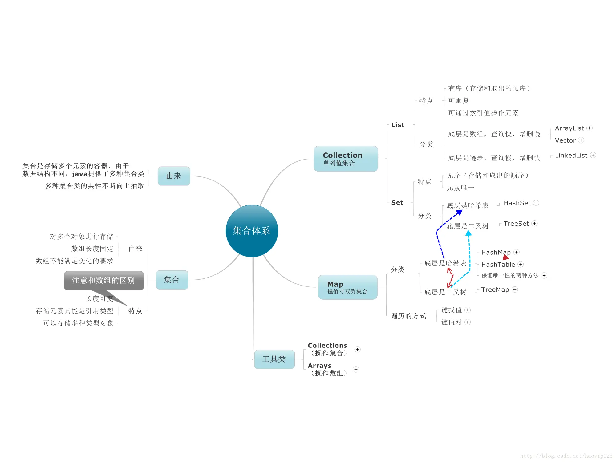 =====================以上是map总结 start================================ Map 是一种把键对象和值对象映射的集合,它的每一个元素都包含一对键对象和值对象。 Map没有继承于Collection接口 从Map集合中检索元素时,只要给出键对象,就会返回对应的值对象。