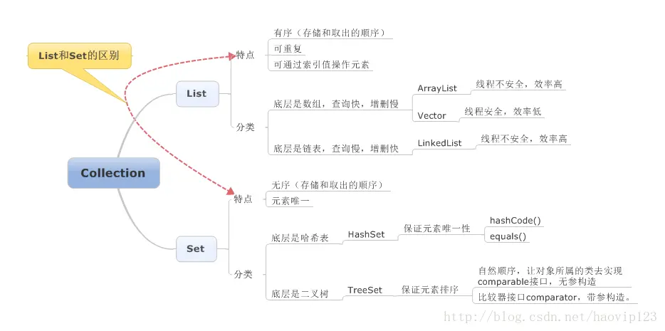Collection是最基本的集合接口,一个Collection代表一组Object,即Collection的元素(Elements)。一些Collection允许相同的元素而另一些不行。一些能排序而另一些不行,于是衍生出两个子类接口List和Set。
