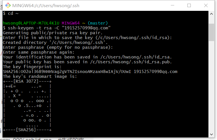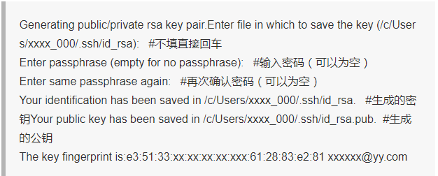 $ ssh-keygen -t rsa -C "xxxxxx@yy.com" #后面双引号是注册git账号时的邮箱有些东西可以不填,直接回车;
