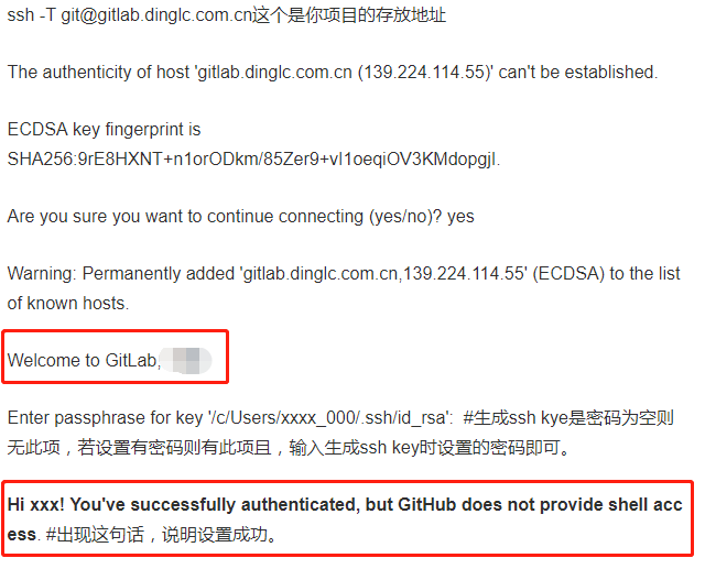 6. 测试ssh keys是否设置成功;(没有密码的直接yes回车就好了)