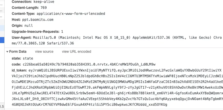 当用户给予授权后,apple服务器将发起一个POST请求至当时设置的redirectURI,同时附上一个授权码code,id_token可用于刷新token,这里的id_token字段只有通过验证后才会有,首次请求并没有这个字段,首次验证通过后再次登录可直接通过解析这个id_token来获得用户唯一标识,这里首次登录,我们将只有code和state,如下图