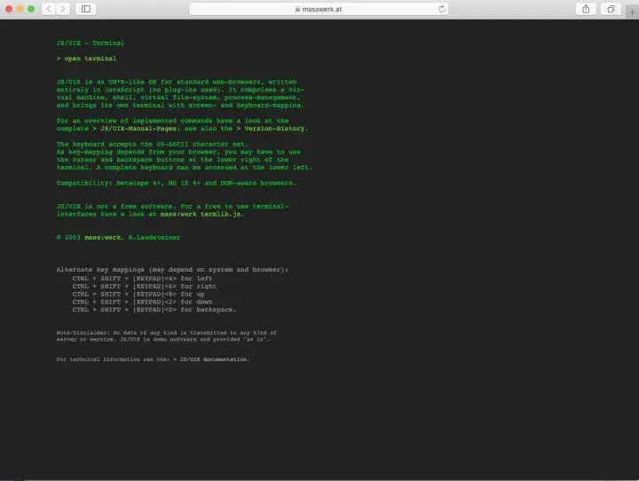 直接进入,点击 open terminal。就可以开始把玩了!它提供非常简单的终端环境,并没有自带 gcc 等编译套件,适合用于练习基本命令和 shell 脚本。