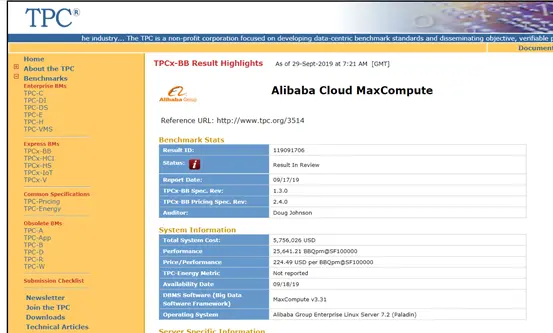 2019年9月17日,TPC官宣Alibaba Cloud MaxCompute认证结果。同月26日,杭州云栖大会阿里巴巴宣布了这一成绩,飞天大数据平台计算引擎MaxCompute成为全球首个TPCx-BB认证的公共云产品,是除Hive、Spark以外TPCx-BB第三个标准支持的大数据引擎。不仅首次将数据规模拓展到100TB,性能达到25641.21QPM,更在TPCx-BB已有最大30TB规模上,将性能提升近一倍,达到6427.86QPM,单位价格下降一半,达到169.76$/QPM。