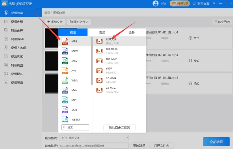 2、添加好文件后可以先设置输出格式,因为要把kux格式转换成mp4且设置为和原文件相同的分辨率为佳,所以把输出格式分别设置为mp4和同原文件格式。