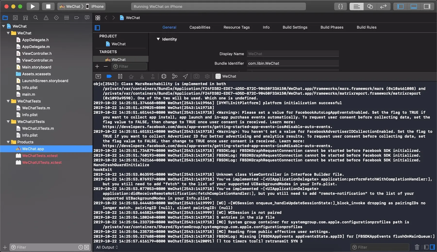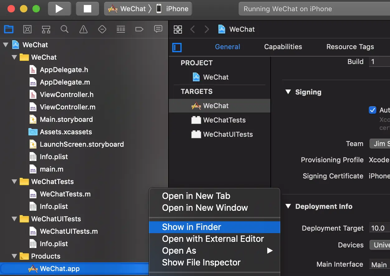 这个时候 App 包里的Bundle ID 还是微信的 ,但是我们先不改 , 直接运行 .