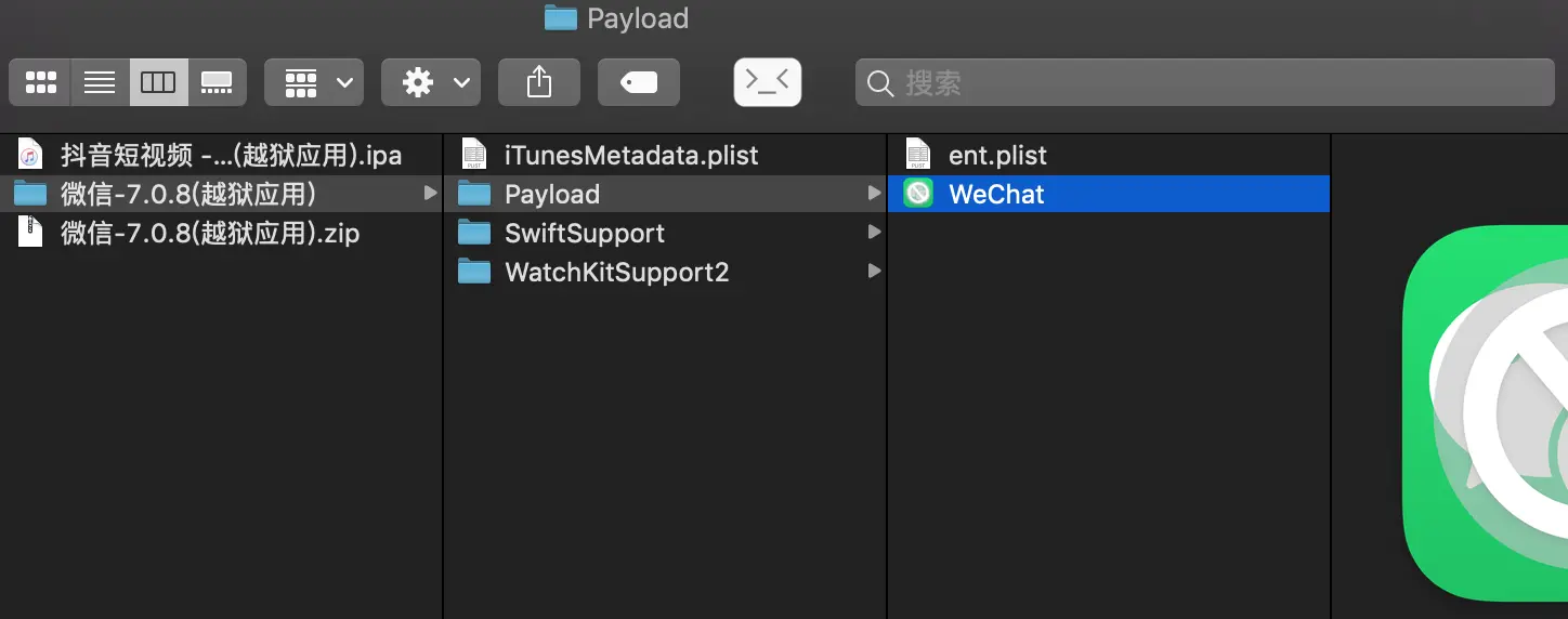 zip -ry Wechat.ipa Payload( 其实不重新压缩也可以 跟我们shell脚本里对应起来就好了 ) .