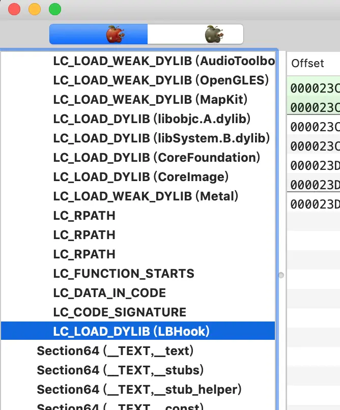 修改完毕后可以利用 MachOView 来看下我们的加载指令添加进去了没.