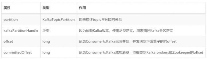 KafkaTopicPartitionState 是一个非常核心的数据结构,基于内部的 4 个基本属性,Flink Kafka Consumer 维护了 topic、partition、已消费 offset、待提交 offset 的关联关系。Flink Kafka Consumer 的容错机制依赖了这些数据。