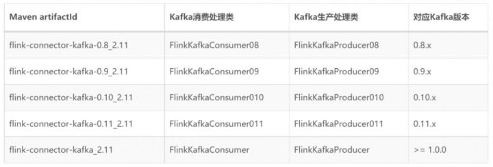 </dependency>在上面的依赖配置中 ${flink_version} 指使用 Flink 的版本,${flink_connector_kafka_version} 指依赖的 Kafka connector 版本对应的 artifactId。下表描述了截止目前为止 Kafka 服务版本与 Flink Connector 之间的对应关系。