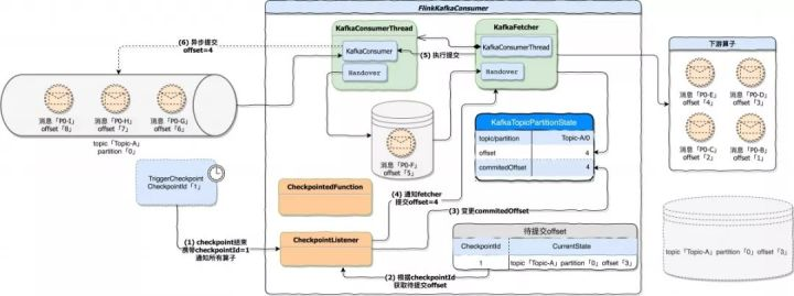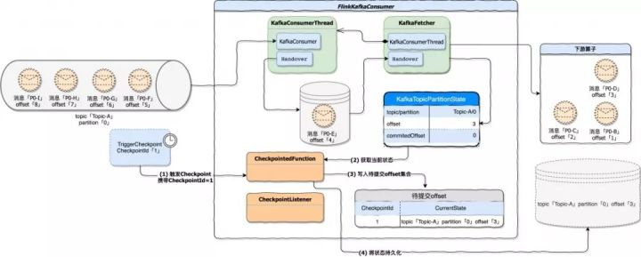下图描述当一轮 Checkpoint 开始时 FlinkKafkaConsumer 的处理过程。在例子中,FlinkKafkaConsumer 已经将 offset=3 的 P0-D 消息发送到下游,当checkpoint 触发时将 topic=Topic-A;partition=0;offset=3 作为最后的状态持久化到外部存储。