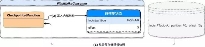 - 步骤 3,使用状态后端的快照结果 topic=Topic-A;partition=0;offset=3 初始化 Flink Kafka Consumer 内部维护的 Kafka 处理状态。因为是恢复流程,所以这个内部维护的处理状态也应该随着快照恢复。