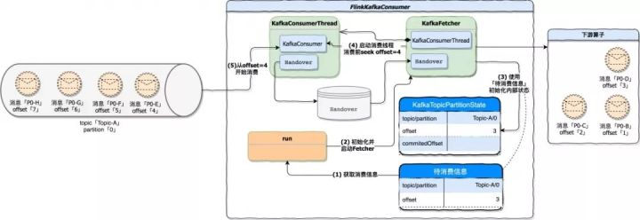 在该阶段中,将 KafkaFetcher 初始化、初始化内部消费状态、启动消费线程等等,其目的是为了将 FlinkKafkaConsumer 运行起来,下图描述了这个阶段的处理流程。