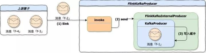 上游算子不断的将数据 Sink 到 FlinkKafkaProducer,FlinkKafkaProducer 接到数据后封装 ProducerRecord 对象并调用 Kafka 客户端 KafkaProducer.send 方法将 ProducerRecord 对象写入缓冲「源代码 FlinkKafkaProducer.java 616 行」。下图是该阶段的描述: