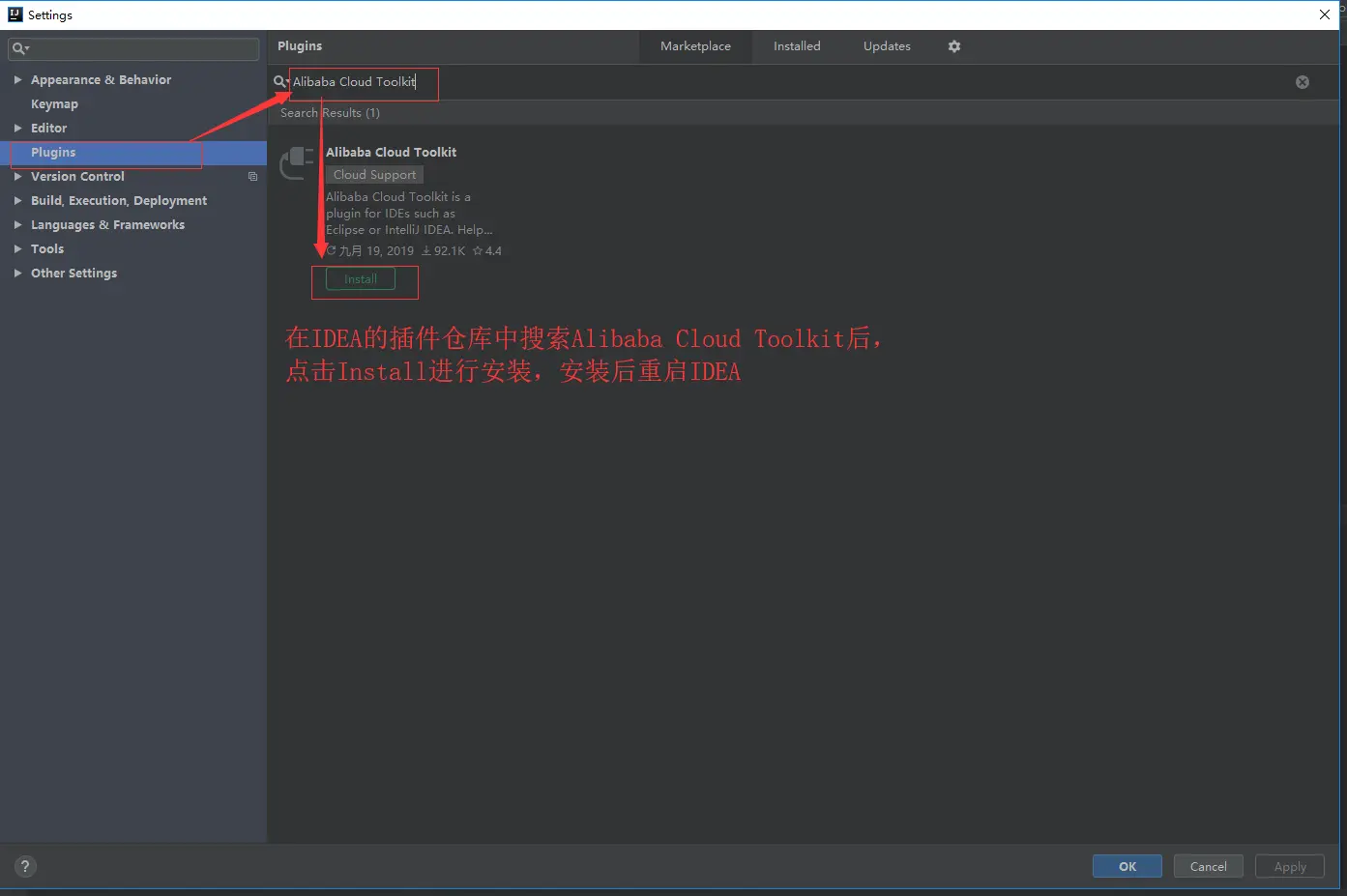 第 2 步:进入 Plugins 选项,搜索“Alibaba Cloud Toolkit”,并安装即可,如下图:
