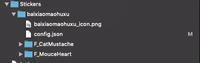 一般来说贴纸是要做成动态下载的,所以我们需要构建一个Json。如下结构可以根据业务需求自行拓展。 资源结构 (F_CatMustache 和 F_MouceHeart 图片文件夹, 格式统一 fileName_000.png)